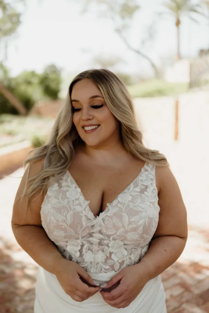 Ivy by Martina Liana is 3d bridal enchantment at its finest. Charming wide-set straps with lace appliques pair with a timeless sweetheart neckline for an oh-so-romantic look. The fit-and-flare silhouette of this wedding dress effortlessly hugs the body’s natural curves, with comfort fit lining providing an extra layer of comfort.